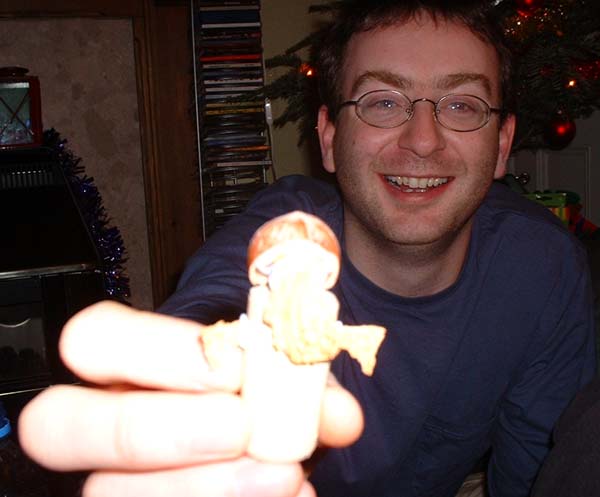 Liam, proffering a voodoo doll made from hazelnut shells, blutack and cork. Notice the slightly manic expression and staring eyes.